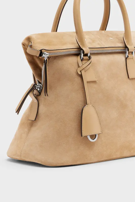 The 5AC Soft Medium brings a textural edge to the Maison’s icon. Shaped in suede leather, the pliant body collapses into folds, revealing a silhouette in motion. Top handles and a detachable strap ground the design in versatile function. The iconic 5AC line takes its name from the French word 'sac' (bag). It explores the Maison’s Anonymity of the lining concept. At the front, four white stitches affirm its signature.