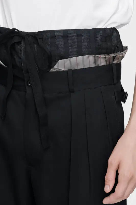 A deliberate reveal at the waist reframes these wool trousers. The lining emerges above the waistband, paired with a drawstring overlay – the Maison’s anonymity of the lining translated into everyday tailoring. Front pleats and a long, straight leg and the exposed interior adds tension between polish and ease. At the back, the Maison’s signature four stitches appear; the opposite of a label.