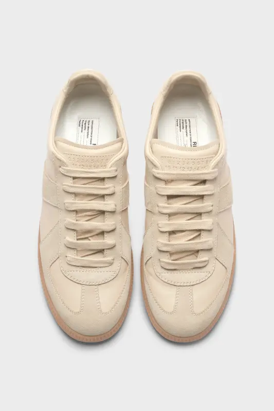 The Replica sneakers in nappa leather and suede with a honey sole. The Maison's iconic Replica sneakers are inspired by Austrian sports shoes from the seventies. Details on the Replica pairs are continually reworked in line with the season's inspirations.