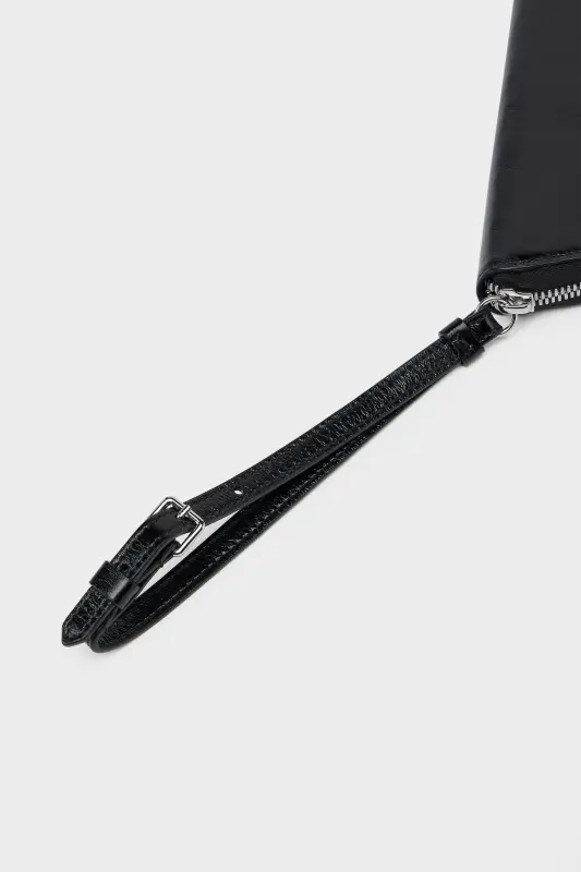 A half-moon pouch in a wrinkled glossy leather. The mini bag features a metallic zipped main compartment, adjustable wrist strap and is finished with the Maison’s signature, the four stitches; the opposite of a label.