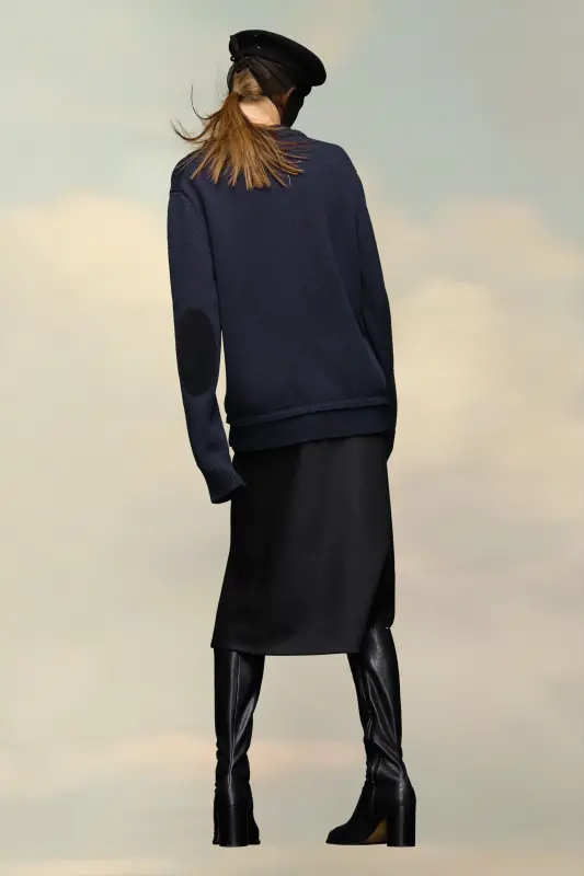 This crew-neck knit sweater with long sleeves and ribbed trims features tonal elbow patches. At the back, four white stitches show the hand of the Maison: the opposite of a label. Gauge 5.