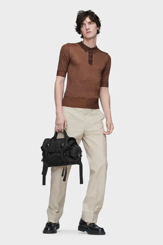 This striped knit polo is crafted in fine wool in a dandy check, offering a slim silhouette with ribbed trims that frame the collar, sleeves, and hem. A button placket sharpens the design. At the back, the Maison’s signature four stitches appear; the opposite of a label.