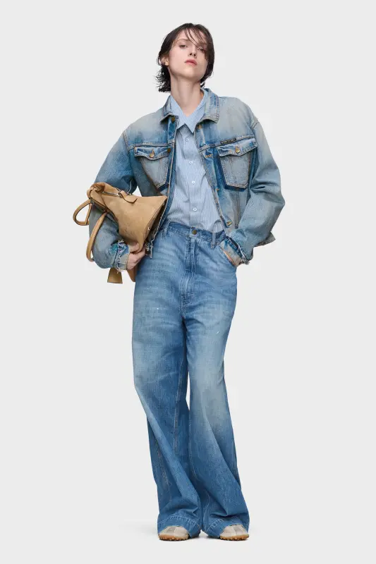 Cut from washed cotton denim, this jacket reflects the Maison’s exploration of lived-in garments. Subtle fading, frayed hems and softened seams create a patina of wear, while metal button fastenings, flap chest pockets and a subtle, vintage-inspired Maison Margiela label detail nod to archetypal denim design. At the back, the Maison’s signature four stitches appear; the opposite of a label.