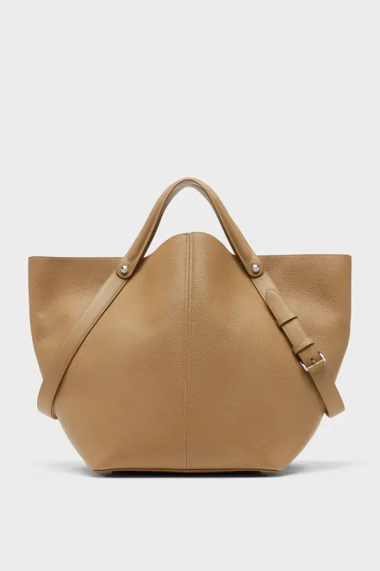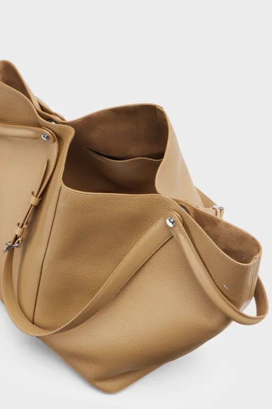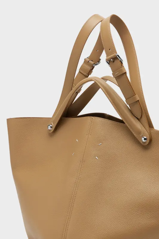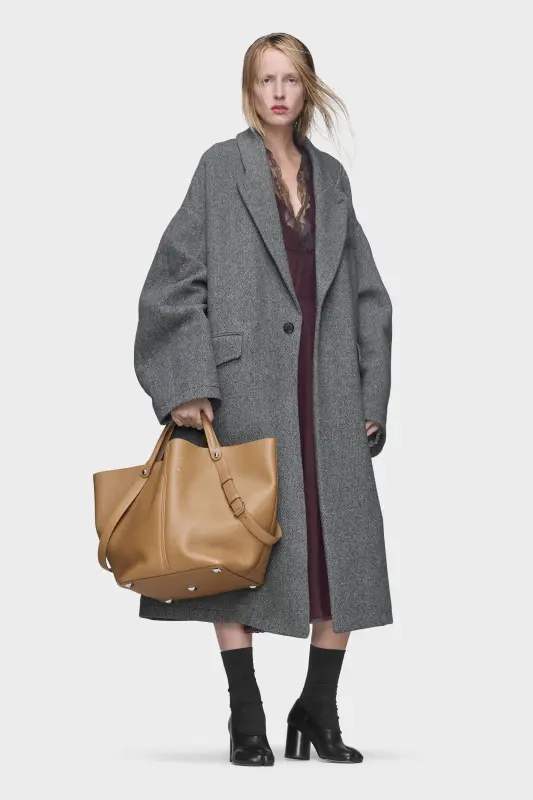 The Maison launches the Dress-age handbag for SS25, crafted from soft pebbled calfskin. With an equestrian spin, the large handbag features classic leatherwork and refined lines, combining unconscious glamour with gestural design. It follows a trapezoid shape with contrast dual-wear strap detail. The studded base allows the bag to stand, and the inner is adorned with the logo. Maison Margiela's signature, the four stitches, appear at the back; the opposite of a label.