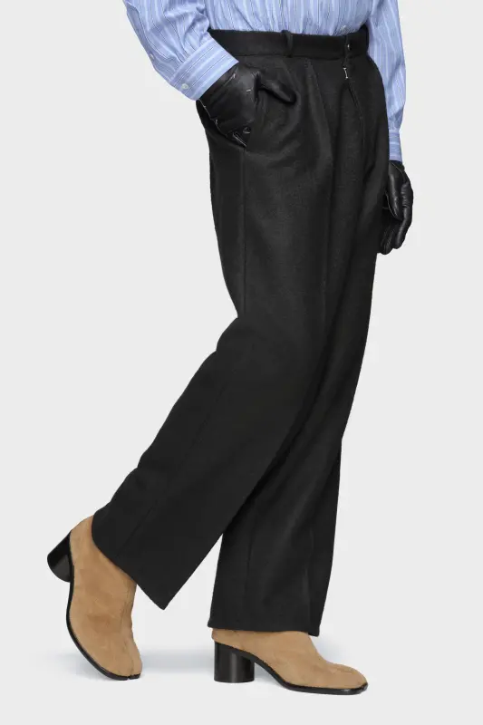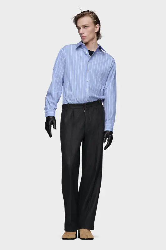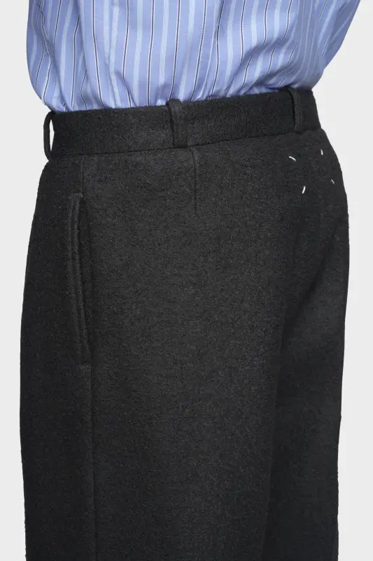 These straight-leg trousers are tailored in felted wool for a softly structured finish. Belt loops, side slip pockets and pressed creases recall formal construction, while the pared-back silhouette keeps the line modern. At the back, the Maison’s signature four stitches appear; the opposite of a label.