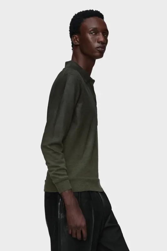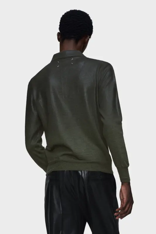 A shaded gradient defines this wool-blend polo, shifting from deep tones to a softened finish. Light plays subtly across its lustrous surface, subverting the uniformity of the knit. The knit is finished with ribbed cuffs, placket, chest pocket and a tonal treatment. At the back, the Maison’s signature four stitches appear; the opposite of a label.