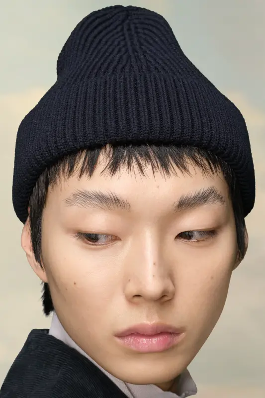 Fisherman-inspired beanie hat in a wool-cotton blend with compact English rib stitch. The Maison's four-stitches moniker adorns the front.