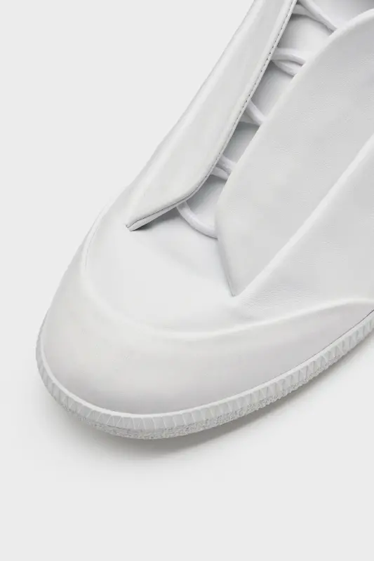 Originally launched in the SS11 collection, the Future sneaker is reintroduced this season. Defined by its seamless construction and concealed fastening. Built without visible laces, a hidden strap folds across the tongue to create a uniform surface, evoking anonymity and restraint. Crafted in soft calfskin, the mid-top silhouette is finished with a tonal sole. Maison Margiela's signature single white stitch appears at the back.​