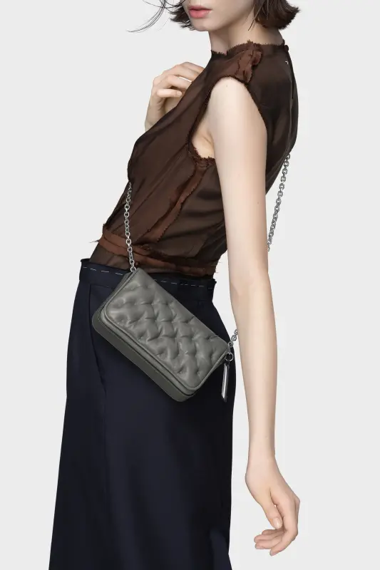 A compact evolution of the Glam Slam, this wallet bag channels the Maison’s idea of unconscious glamour through a quilted, pillow-soft exterior. Its structured form opens to multiple compartments, secured by magnetic fastenings and a polished zip. The chain strap and numeric logo tag add contrast — elegant, industrial, and unexpected.