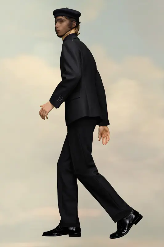 These trousers in herringbone wool are pleated and feature the M button and the Maison Margiela hook and eye closure. They have an adjustable back with additional pocket and are finished with the four white stitches showing the hand of the Maison: the opposite of a label.