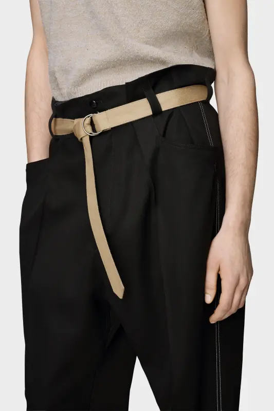 Cut in wool canvas, these trousers are defined by clean lines and a high waistband, pairing precision tailoring with utilitarian contrast. A webbing belt adds a practical edge, reinforcing the functional tone of the piece. Maison Margiela’s signature, the four stitches, appear at the back; the opposite of a label.