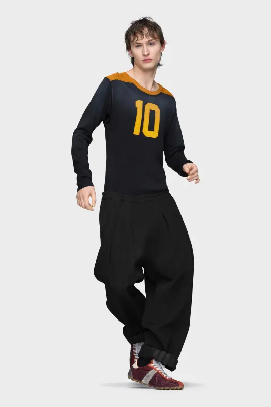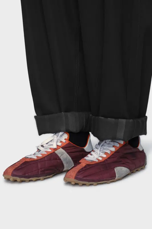 Combining understated structure with comfort, these trousers feature pleated fronts and an elasticated waistband. Cut in wool barathea, their gently tapered shape and fluid movement reflect the Maison’s recalibration of everyday dressing. The hems can be rolled to reveal the Anonymity of the Lining – an understated gesture that echoes the collection’s reworking of countryside classics. Maison Margiela’s signature, the four stitches, appear at the back; the opposite of a label.