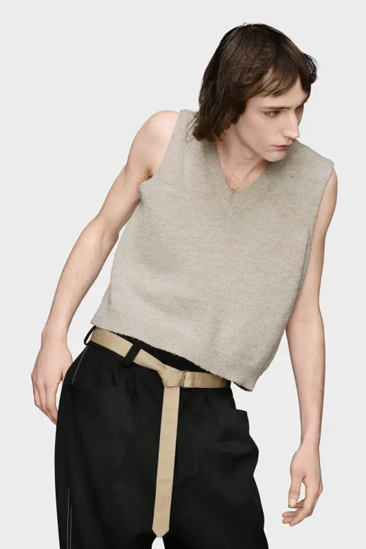 Knitted in a light bouclé weave with a deep V-neck, this vest features a pared-back construction and sleeveless form. Its minimal silhouette evokes the quiet discipline of the collection, reinterpreting traditional wardrobe foundations. Maison Margiela’s signature, the four stitches, appear at the back; the opposite of a label.