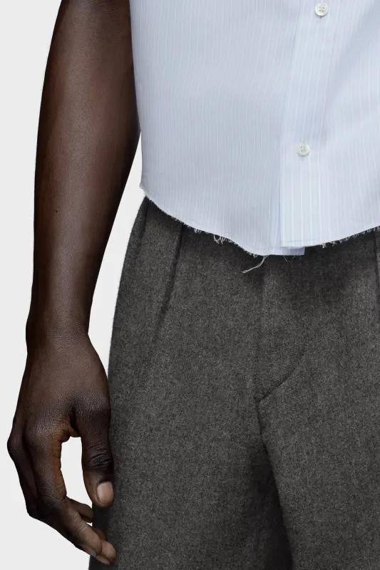This short-sleeved shirt is cropped in length and designed with a classic collar and a reverse Decortiqué chest pocket. The raw hem introduces a subtle note of deconstruction, offering a quietly undone take on everyday shirting. Maison Margiela’s signature, the four stitches, appear at the back; the opposite of a label.