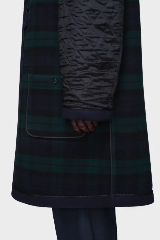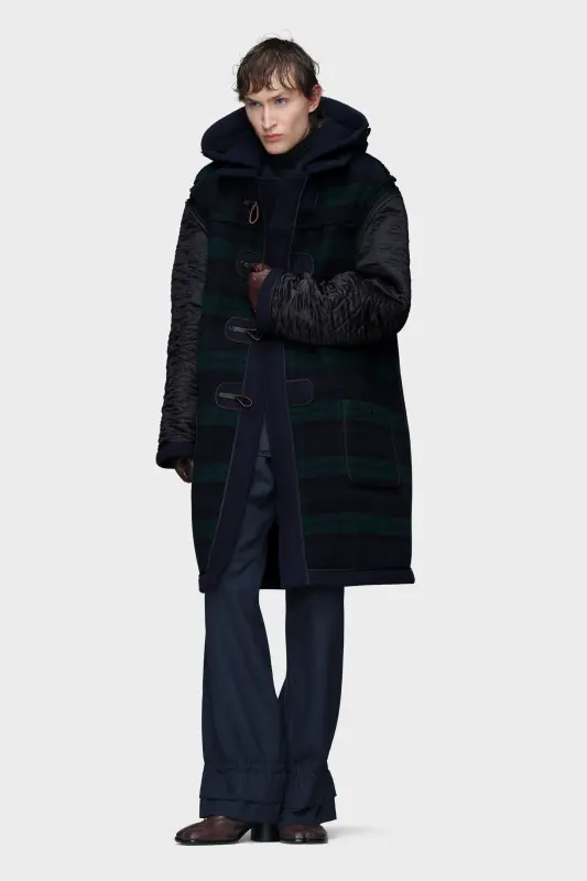 This dual-wear duffle coat is cut from wool with an elongated silhouette, dropped shoulders and a removable hood. Toggle fastenings reference classic outerwear, while deep patch pockets add everyday function. Reversible by design, the piece offers two interpretations of the same form. Maison Margiela’s signature, the four stitches, appear at the back; the opposite of a label.