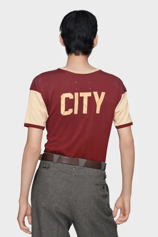 This two-tone t-shirt is printed with a retro “Crystal Hotel” logo in crackled print, echoing the nostalgic language of holiday memorabilia. Its soft construction and tonal collar draw from vintage athletic styles, reinterpreted with subtle disruption. Maison Margiela’s signature, the four stitches, appear at the back; the opposite of a label.