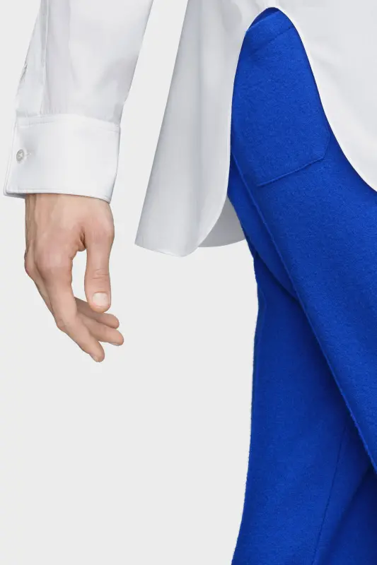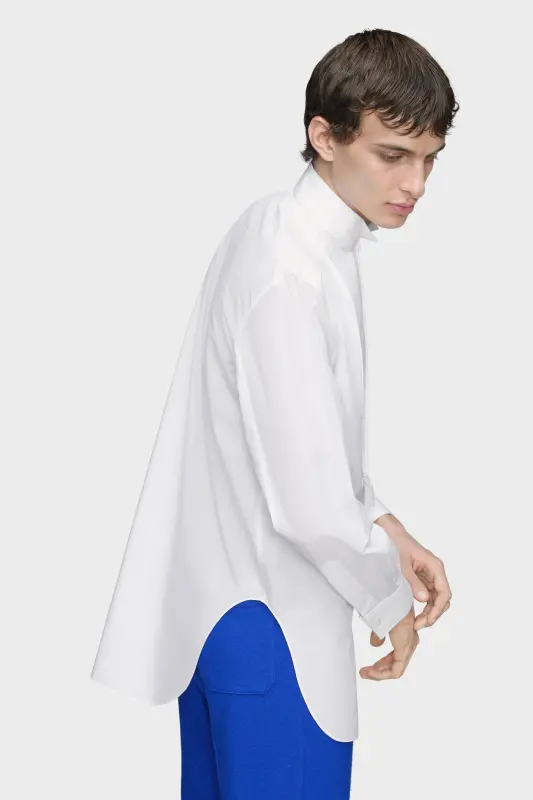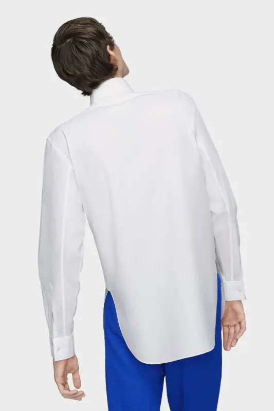 Crafted in crisp cotton poplin, this formal shirt is tailored with a structured bib front and pointed collar – referencing traditional dress codes. Maison Margiela’s signature, the four stitches, appear at the back; the opposite of a label.