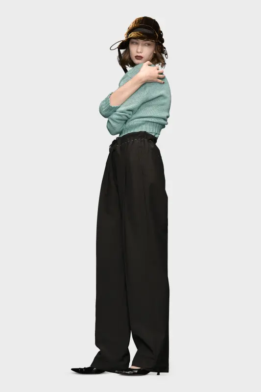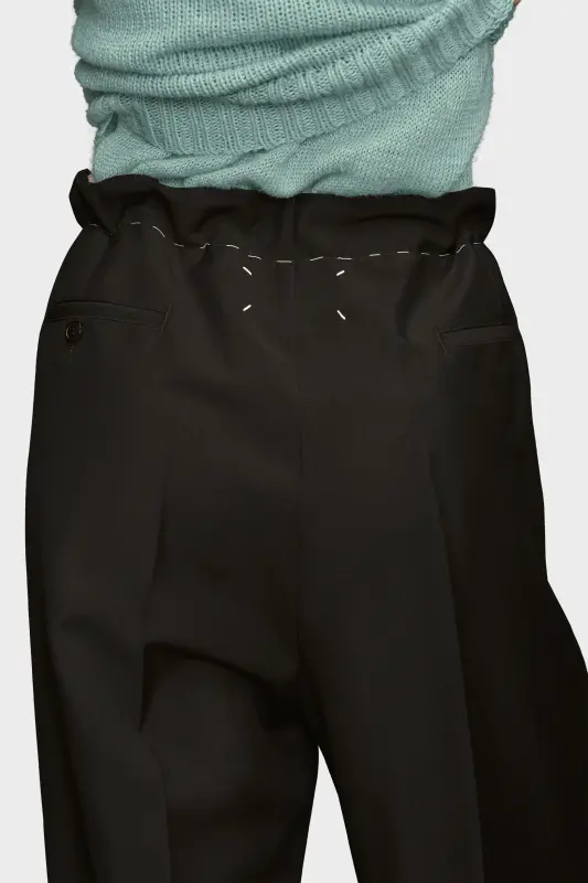 The trousers are crafted from mohair wool. They feature an extra-long length with pleats down the front and back – a smart contrast to the tied drawstring waist. A tonal band appears around the bottom of each leg as well as contrast work-in-progress stitches which circle the waistband for a style disruption. Maison Margiela's signature, the four stitches, appear at the back; the opposite of a label.