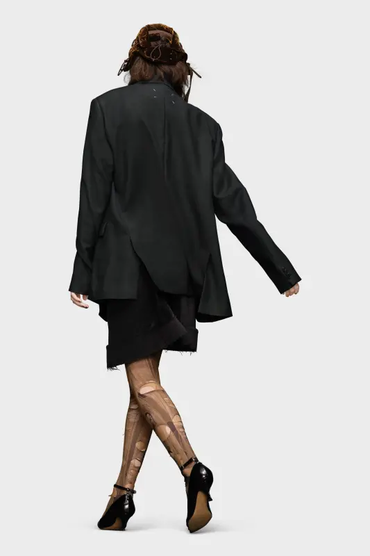 Crafted from mohair wool, the suit jacket has a long-line silhouette with slightly oversized proportions. It features single-breasted buttons, a notched collar, pockets and buttons at the cuffs. Two work-in-progress cross-stitches adorn the back hem to allude to a garment never being finished. Maison Margiela's signature, the four stitches, appear at the back; the opposite of a label.