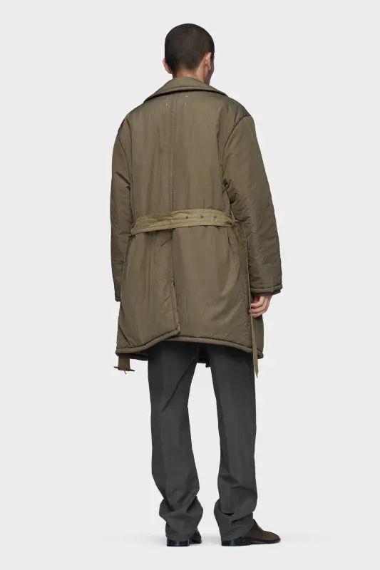 Maison Margiela reworks the caban in nylon, creating a coat defined by comfort and ease. Padded throughout, it gains a structured yet protective quality, while the belted waist, broad lapels and button closure retain its classic form. At the back, the Maison’s signature four stitches appear; the opposite of a label.