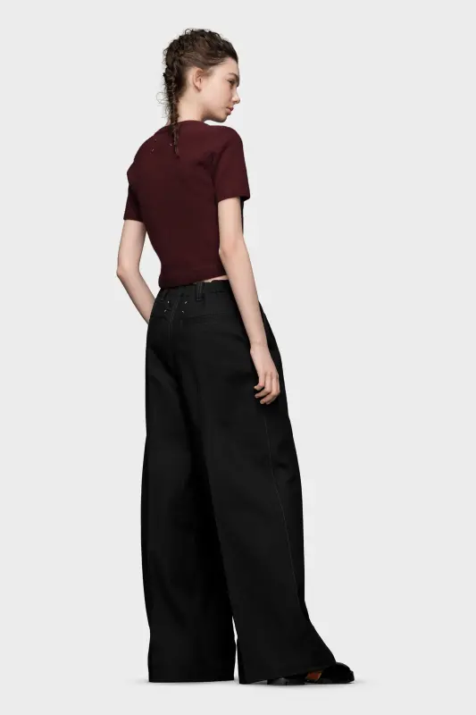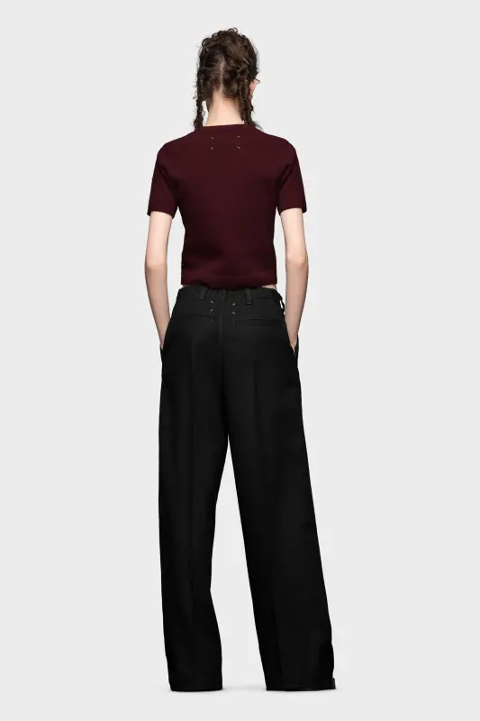In a wool cotton blend, the trousers feature front pleats, high-waist and wide-leg. They have a Margiela hook closure, belt loops and pockets. Maison Margiela's signature, the Four stitches, appear at the back; the opposite of a label.