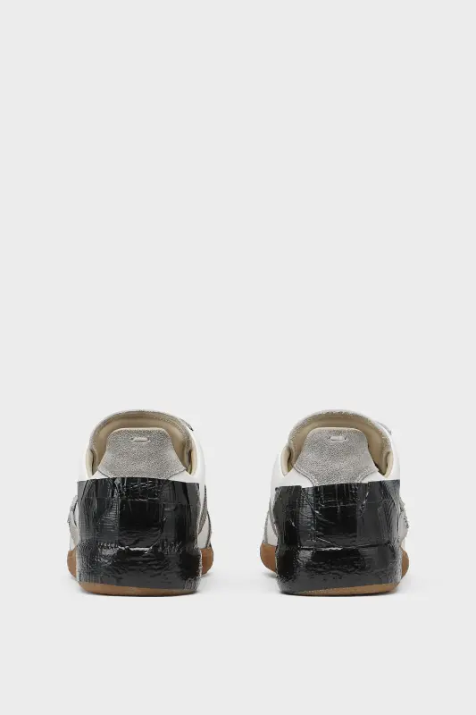 The Replica sneakers in smooth calfskin leather and suede with a honey sole. This season reinterpreted with tape detailing, a nod to the used and repaired house code. The Maison's iconic Replica sneakers are inspired by Austrian sports shoes from the seventies. Details on the Replica pairs are continually reworked in line with the season's inspirations. Maison Margiela's signature single white stitch appears at the back.
