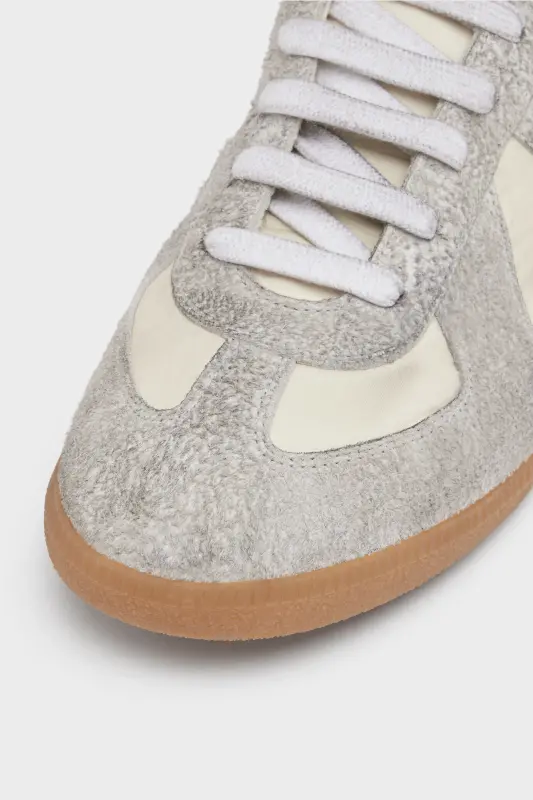The Replica sneakers in dirty treatment nylon and hairy suede are supported by a classic rubber sole. The Maison's iconic Replica model is inspired by Austrian sports shoes from the seventies. Details on the Replica pairs are continually reworked in line with the season's inspirations. Maison Margiela's signature white stitch appears at the back.