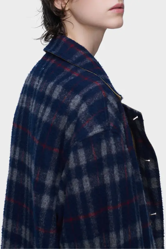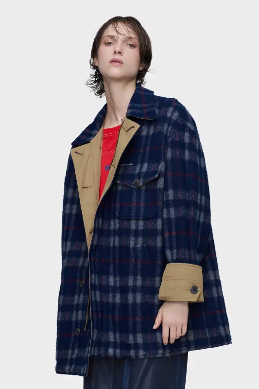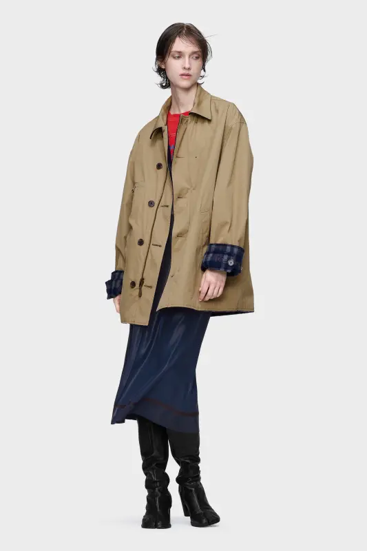 Reversible by design, this caban moves fluidly between tailored check wool and a plain, pared-back cotton surface. The double-breasted closure and adjustable cuffs retain the language of classic caban construction, while reversibility offers a layered dialogue. At the back, the Maison’s signature four stitches appear; the opposite of a label.