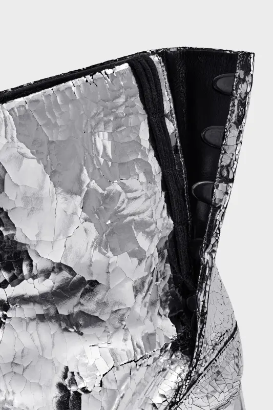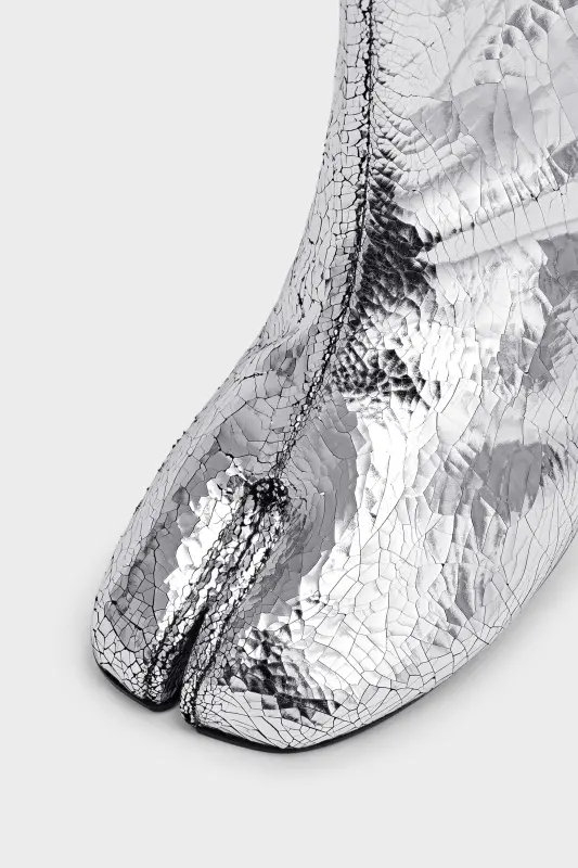 Crafted in a broken mirror finish, these low-heeled ankle boots feature the Tabi split-toe, inspired by the traditional 15th century Japanese sock bearing the same name – launched for the Maison's debut collection in 1989. It captures the avant-garde and insubordinate spirit of the Maison and exists as a heritage classic, continually explored through each collection.