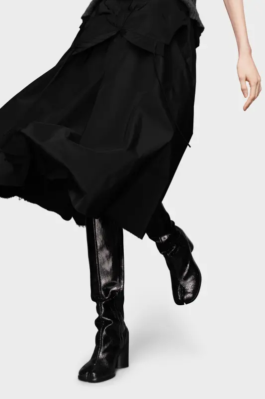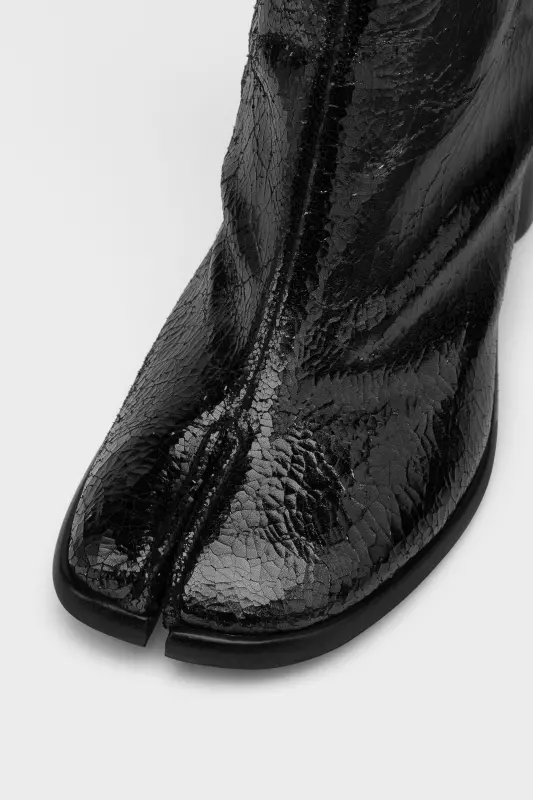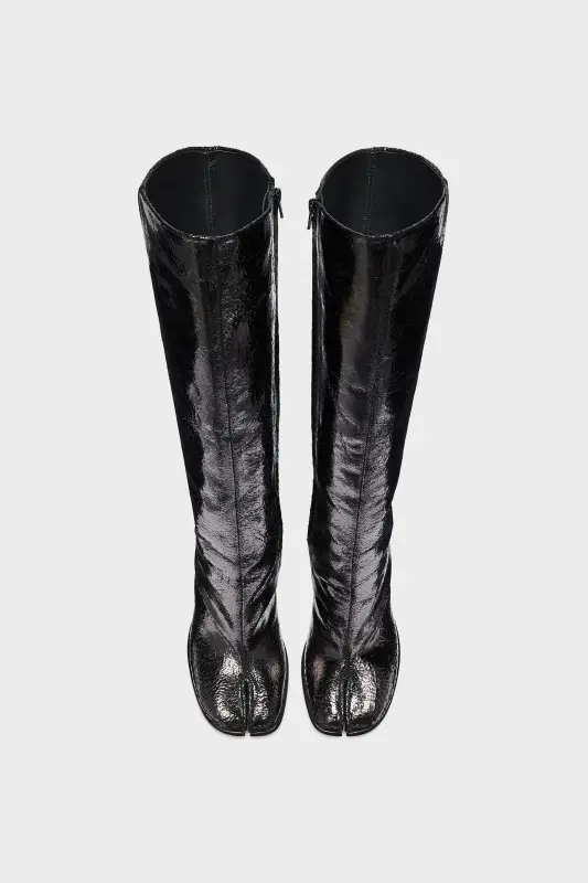With a broken mirror finish, these heeled knee-high boots feature the Tabi split-toe, inspired by the traditional 15th century Japanese sock bearing the same name – launched for the Maison's debut collection in 1989. It captures the avant-garde and insubordinate spirit of the Maison and exists as a heritage classic, continually explored through each collection.