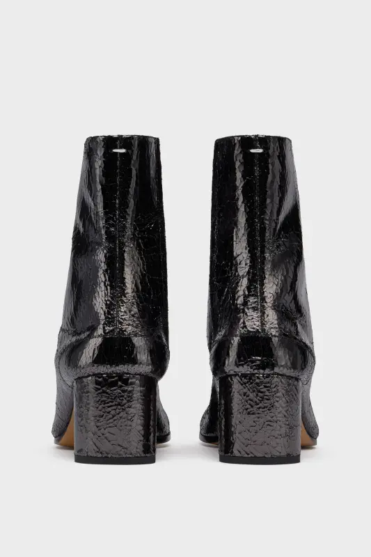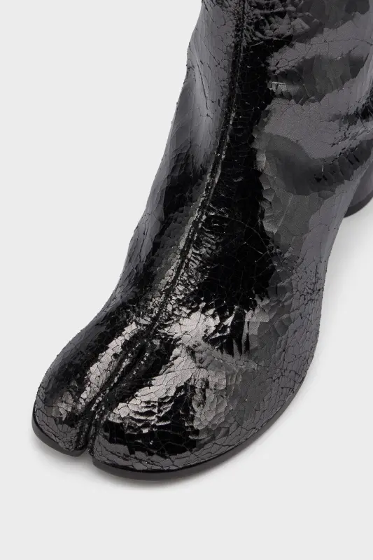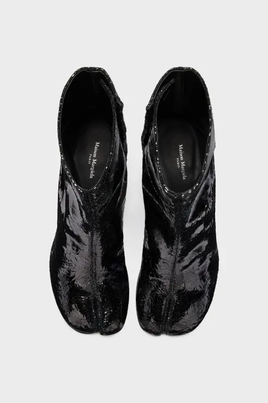 Crafted in a broken mirror finish, these block-heel ankle boots feature the Tabi split-toe, inspired by the traditional 15th century Japanese sock bearing the same name – launched for the Maison's debut collection in 1989. It captures the avant-garde and insubordinate spirit of the Maison and exists as a heritage classic, continually explored through each collection.