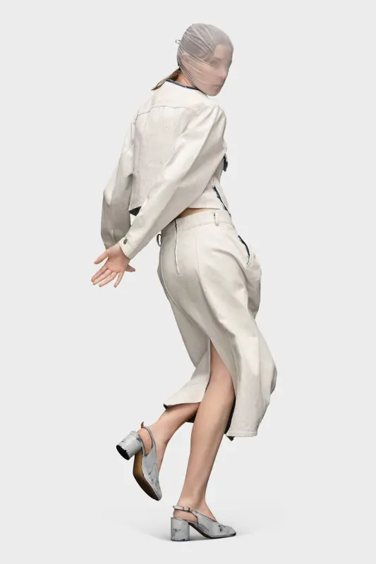 This fitted collarless denim jacket is cropped at the waist and has a cracked white effect. It features classic metal hardware and seam detailing. The contrast neck has a raw finish and the back shows the four white stitches, showing the hand of the Maison: the opposite of a label.