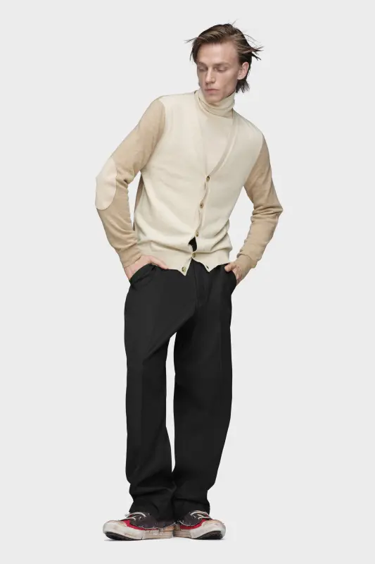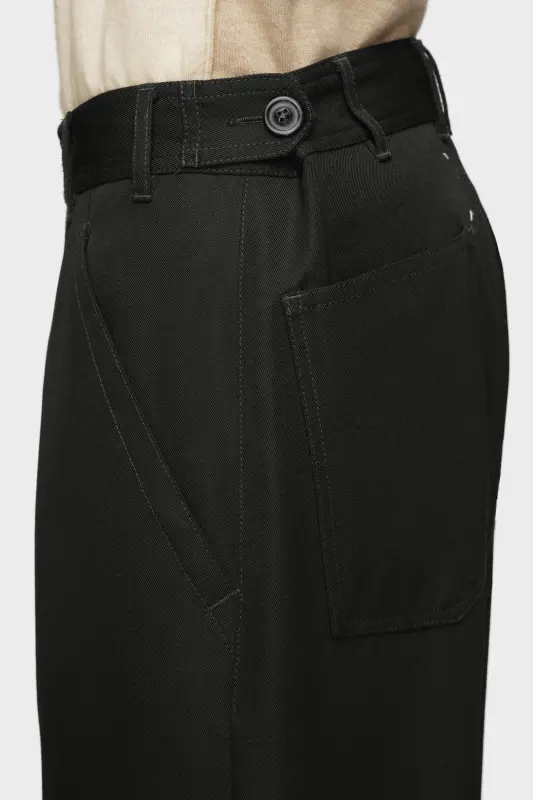 These wide-leg trousers feature crisp pleats, a high waistband, and neatly cuffed hems. Rear patch pockets and adjustable side tabs strike a balance between function and form. At the back, the Maison’s signature four stitches appear; the opposite of a label.