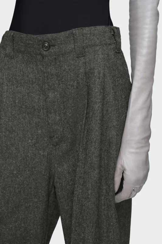 Cut from weighty wool with a tactile finish, these trousers fall in a soft, oversized line. The double front pleats and subtle texture add quiet complexity to a utilitarian silhouette. At the back, the Maison’s signature four stitches appear; the opposite of a label.