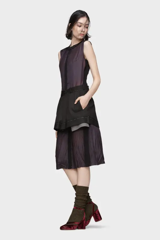 This piece deconstructs the notion of a classic dress, fusing tailored elements with internal construction. A structured waistband evokes trouser forms, stitched over a lined, raw-cut silhouette. Executed using Maison Margiela’s Décortiqué technique, the garment exposes its inner layers as part of its outer expression. Maison Margiela’s signature, the four stitches, appear at the back; the opposite of a label.