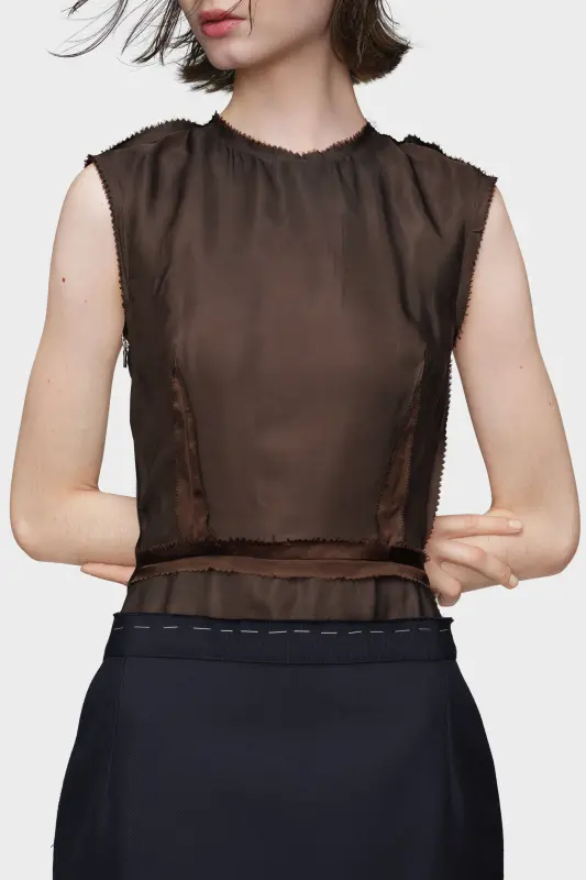 This knee-length, sleeveless dress reinterprets classic formalwear through inside-out construction, revealing the Anonymity of the Lining technique. A navy techno wool twill skirt contrasts with a brown viscose bodice, finished with raw edges, reverse darts, and visible basting stitches. Work-in-progress stitching at the waist and hem further emphasises the garment’s deconstructed state. The back zip allows versatile styling – worn closed for structure, or open to reveal the Memory of the Gesture. Maison Margiela’s signature, the four stitches, appear at the back; the opposite of a label.