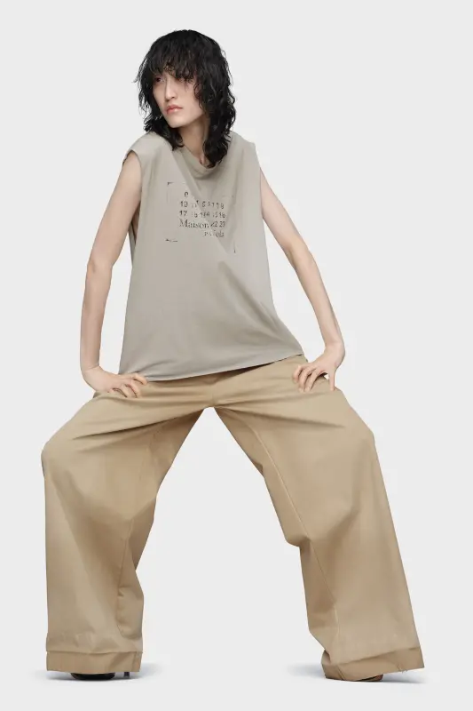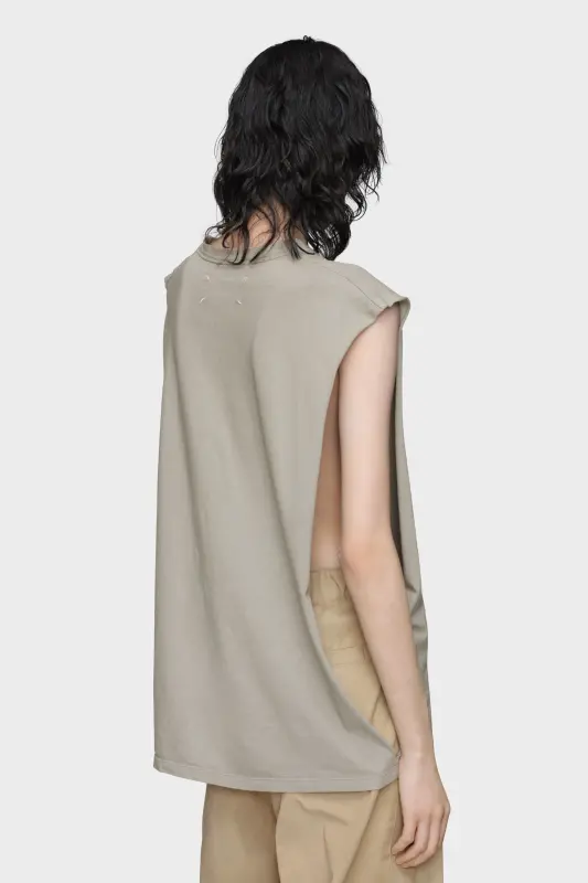 Minimalist in construction and cut for easy layering, this sleeveless top is finished with raw edges and a faded take on the Maison’s numeric logo. Maison Margiela’s signature, the four stitches, appear at the back; the opposite of a label.