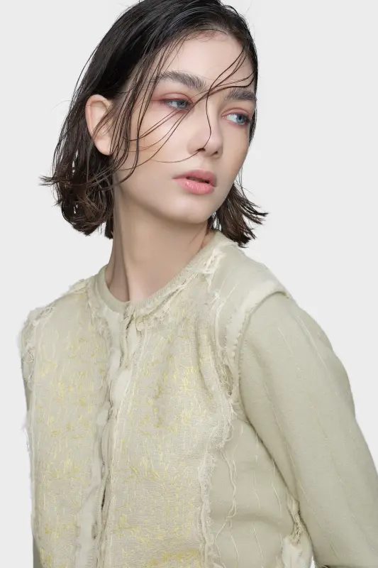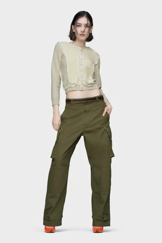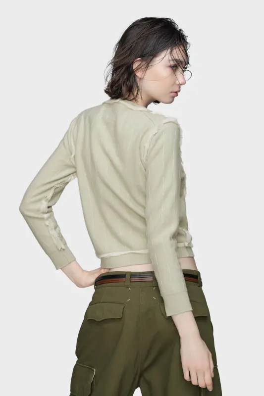 This cardigan is framed by contrast, with appliqué patches that resemble the reverse side of delicately embroidered fabric. Vertical stitch lines mirror the inside of a garment, aligning with the Maison’s décortiqué approach. Maison Margiela’s signature, the four stitches, appear at the back; the opposite of a label.