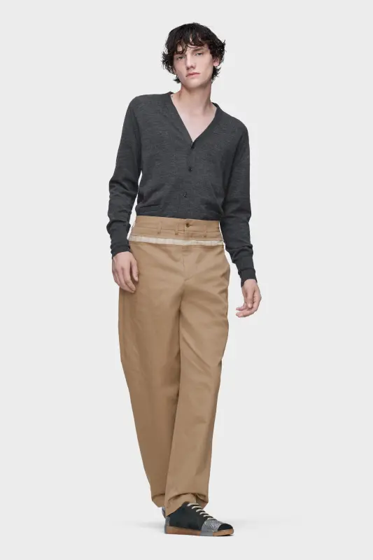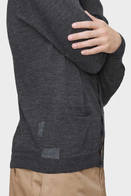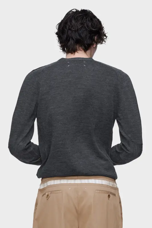 This cardigan is knitted in a fine wool blend, cut with a deep V-neckline and framed by ribbed cuffs and hem. Front buttons and discreet welt pockets underline its minimalist construction. At the back, the Maison’s signature four stitches appear; the opposite of a label.