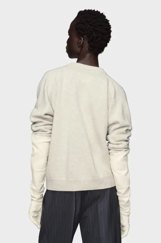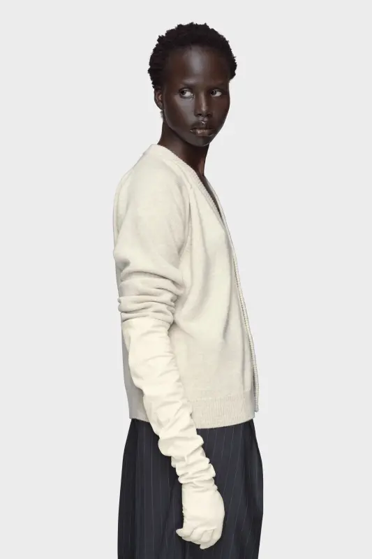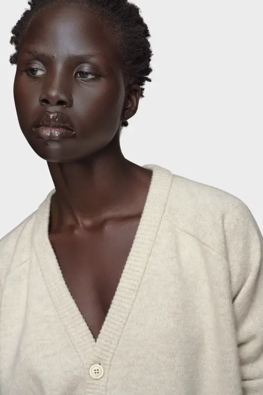 A soft cropped knit top in pure virgin wool, designed with a relaxed silhouette and ribbed finishes. Its deep V-neckline and tonal buttons offer a clean, pared-back finish. At the back, the Maison’s signature four stitches appear; the opposite of a label.