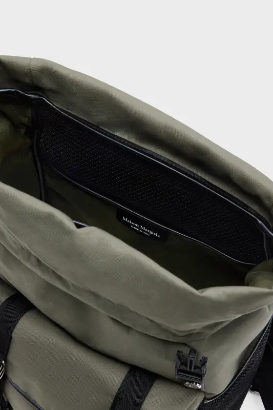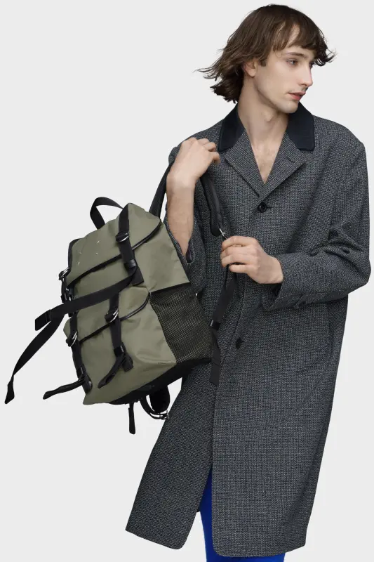 This technical backpack is designed with a structured flap top, dual front straps, and side mesh pockets for breathable utility. A drawstring fastening secures the main compartment, while padded shoulder straps enhance comfort. The Maison’s signature, the four stitches, appear at the front; the opposite of a label.